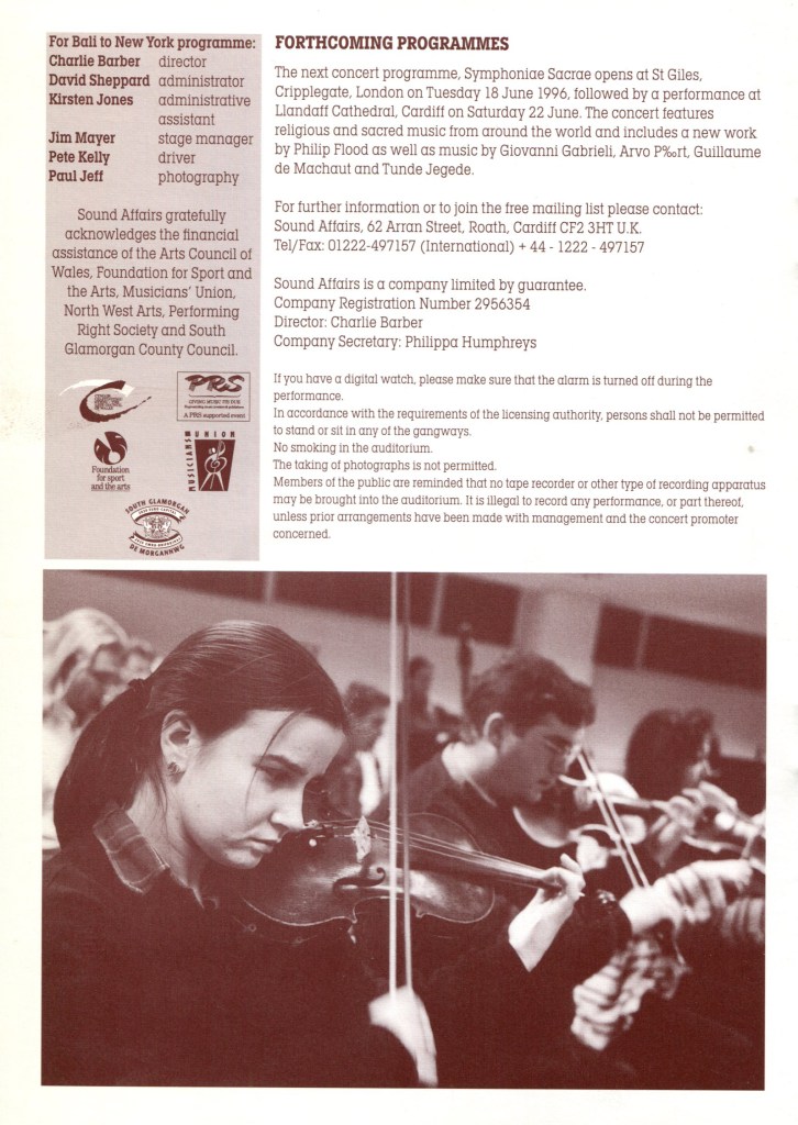 Produced by Sound Affairs with financial support of: Arts Council of Wales, Foundation for Sport and the Arts, Musicians’ Union, Performing Right Society, South Glamorgan County Council
