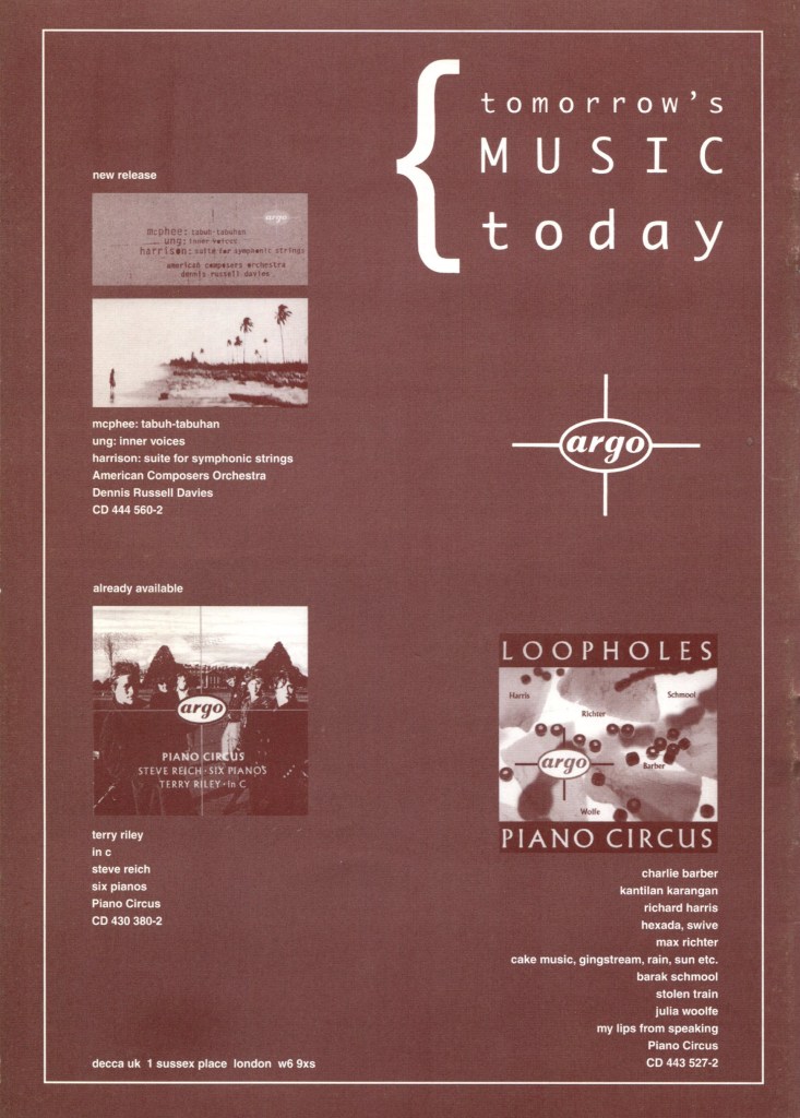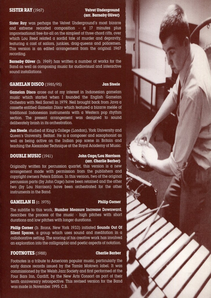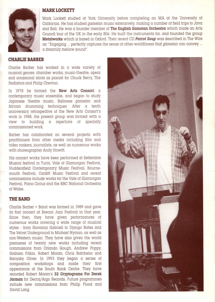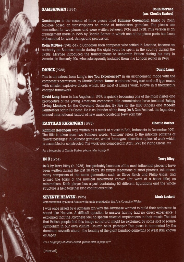 The newest piece of the night was one of the most impressive, Mark Lockett’s Seventh Heaven, being given its world premiere by the Band, mixed pop and jazz with the gamelan sounds in a rhythmically stimulating and imaginative way. It was curious how a chord which is fundamental to Western music takes on such a different mantle when its constituent notes are spread out into a hypnotic gamelan motif. The good vibes and subtle atmosphere of this concert will last a long while.” Rian Evans, The Western Mail, 17 February 1996