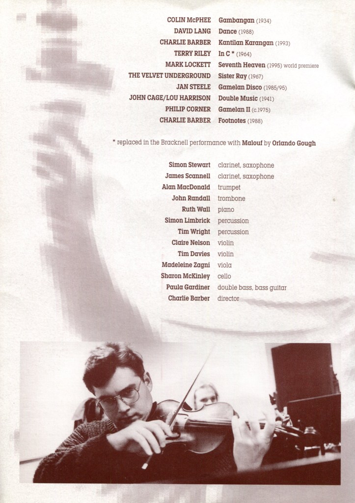 Musicians: Simon Stewart (clarinet, saxophones), James Scannell (clarinet, saxophones), Alan MacDonald (trumpet), John Randall (trombone), Ruth Wall (piano), Simon Limbrick (percussion), Tim Wright (percussion), Claire Nelson (violin), Tim Davies (violin), Madeleine Zagni (viola), Sharon McKinley (cello), Paula Gardiner (double bass, bass guitar)