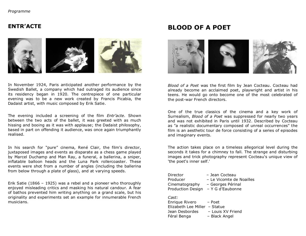 Jean Cocteau’s Le sang d’un poรจte (Blood of a Poet) (1932) explores the technical capabilities of film to magically transcend time, to capture creativity and to suspend physical laws. One of the true classics of the cinema and a key work of Surrealism, Cocteau’s first film is an aesthetic tour de force consisting of a series of episodes and imaginary events. The strange and disturbing images and trick photography represent Cocteau’s unique view of “the poet’s inner self”. Cocteau’s combination of visual poetry and theatrical camp makes this a rich, fascinating and enigmatic film.