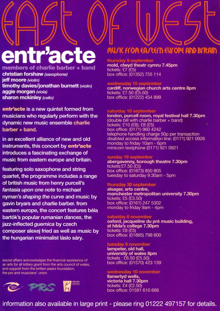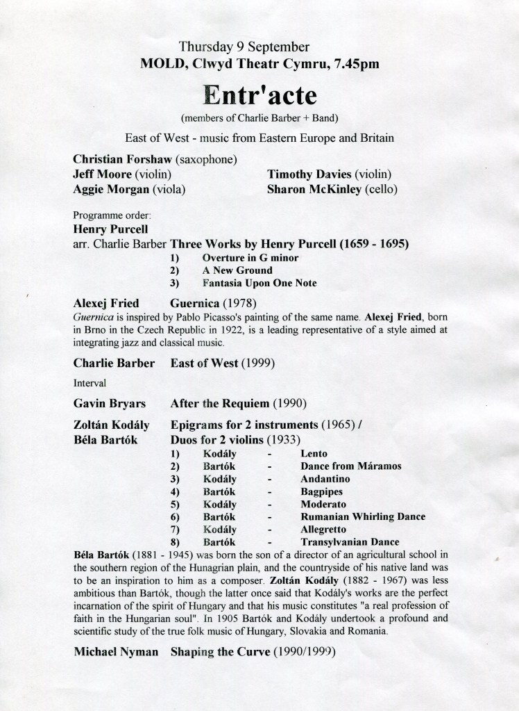 With Christian Forshaw (saxophone), Jeff Moore (violin), Timothy Davies (violin), Aggie Morgan (viola) and Sharon McKinley (cello)