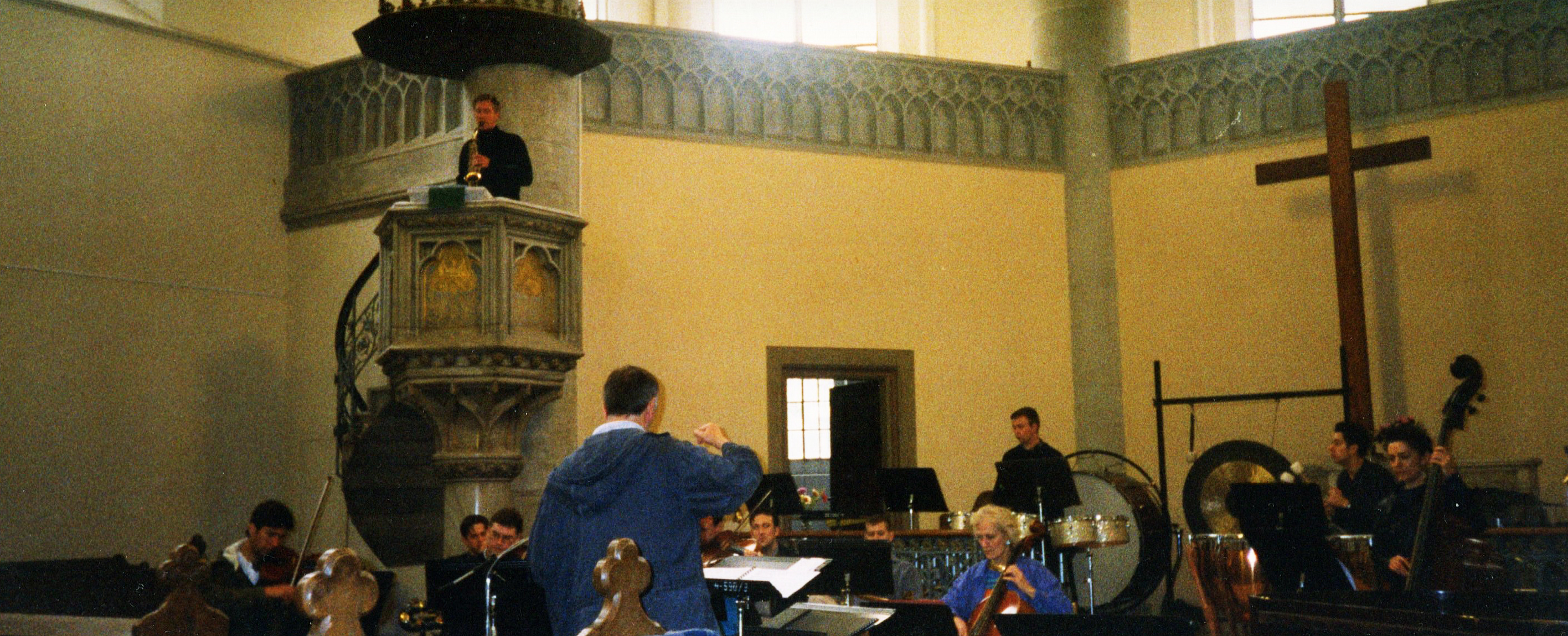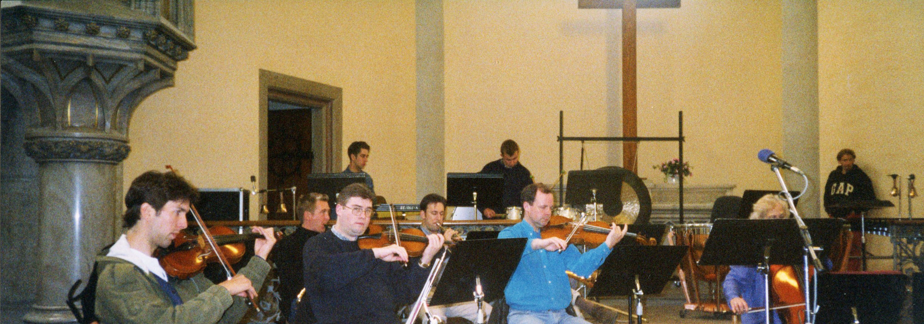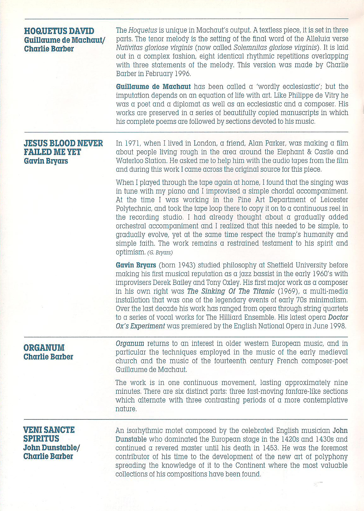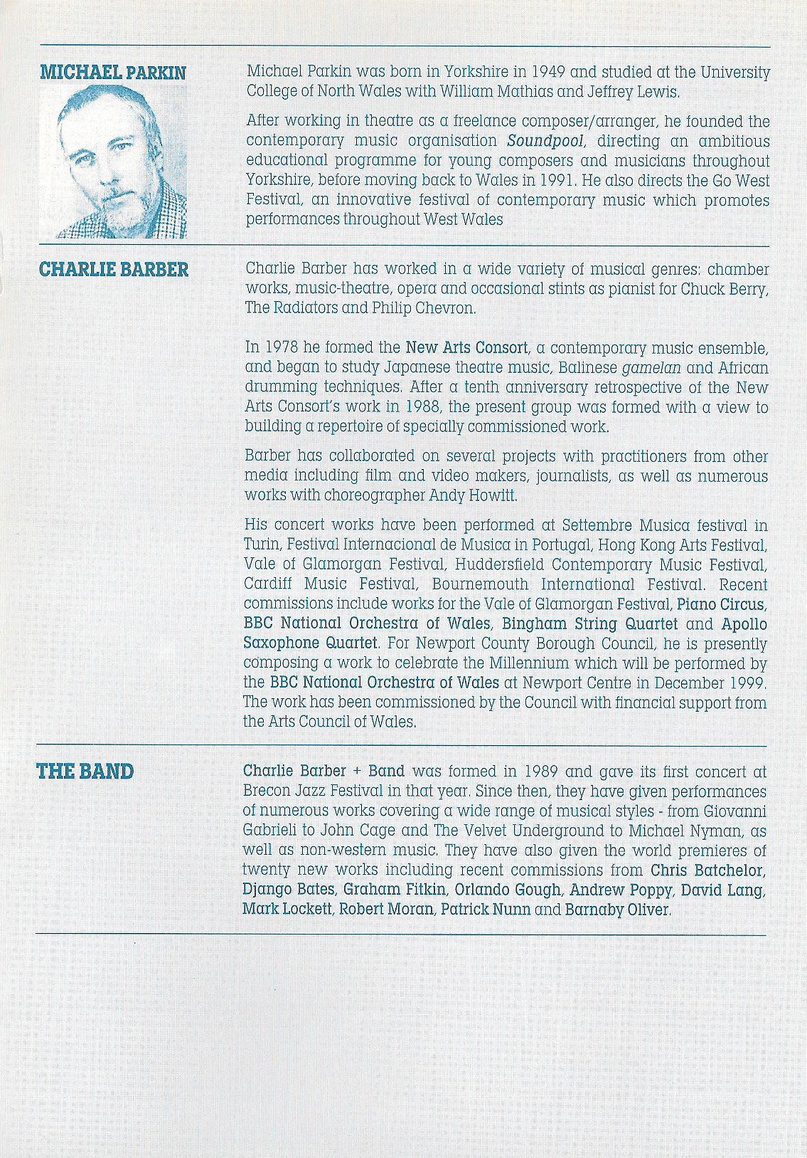 1999 performances: Simon Stewart (clarinet, saxophones), Christian Forshaw (clarinet, saxophones), Rob Samuel (trumpet), Steven Legge (trombone), David Appleton (piano), Matt Whittington (percussion), Harry Fowler (percussion), Jeff Moore (violin), Tim Davies (violin), John Rayson (viola), Sharon McKinley (cello), Paula Gardiner (double bass, bass guitar)