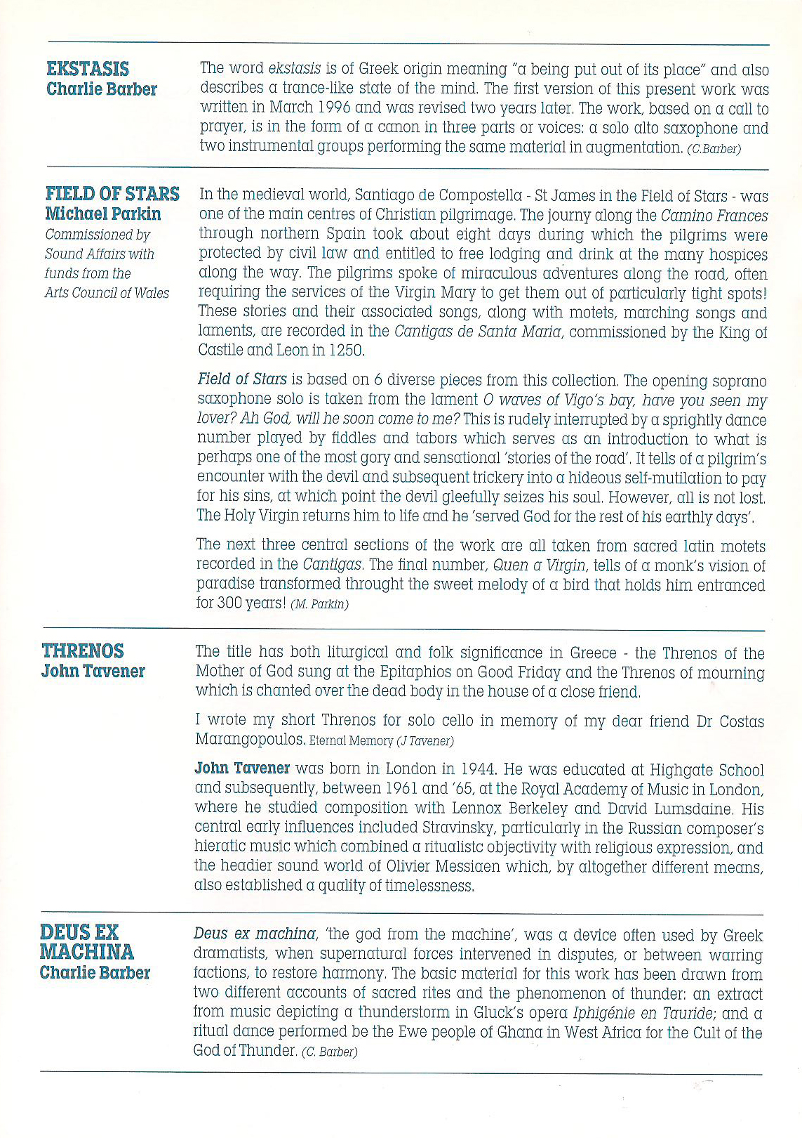 Musicians: 1998 performances: Simon Stewart (clarinet, saxophones), Christian Forshaw (clarinet, saxophones), Alan MacDonald (trumpet), Steven Legge (trombone), David Appleton (piano), Tim Wright (percussion), Harry Fowler (percussion), Jeff Moore (violin), Tim Davies (violin), John Rayson (viola), Sharon McKinley (cello), Paula Gardiner (double bass, bass guitar)