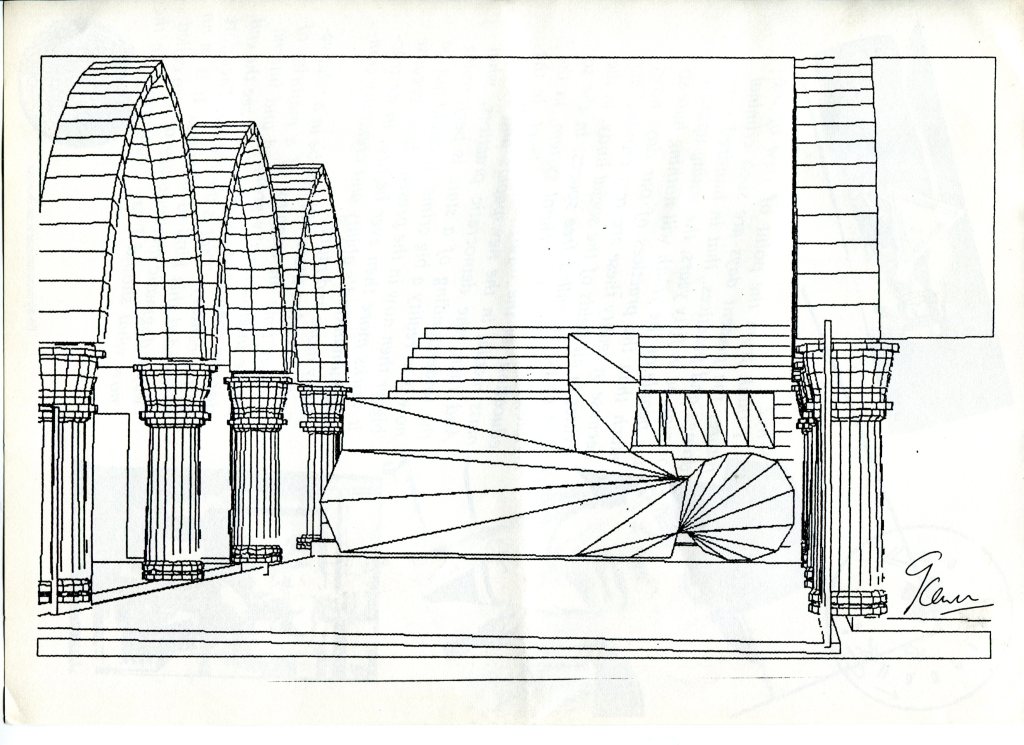 During the performance, the music accompanied the actions of three artists / technicians who intermittently manipulated the performance space to create new spatial structures. In a similar way, the ground bass line which forms the raw material for the music undergoes a number of transformations which develop in three-part canon.