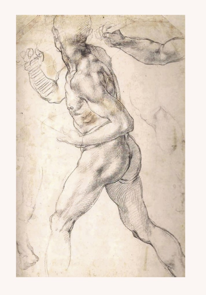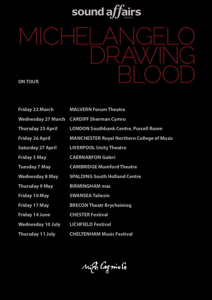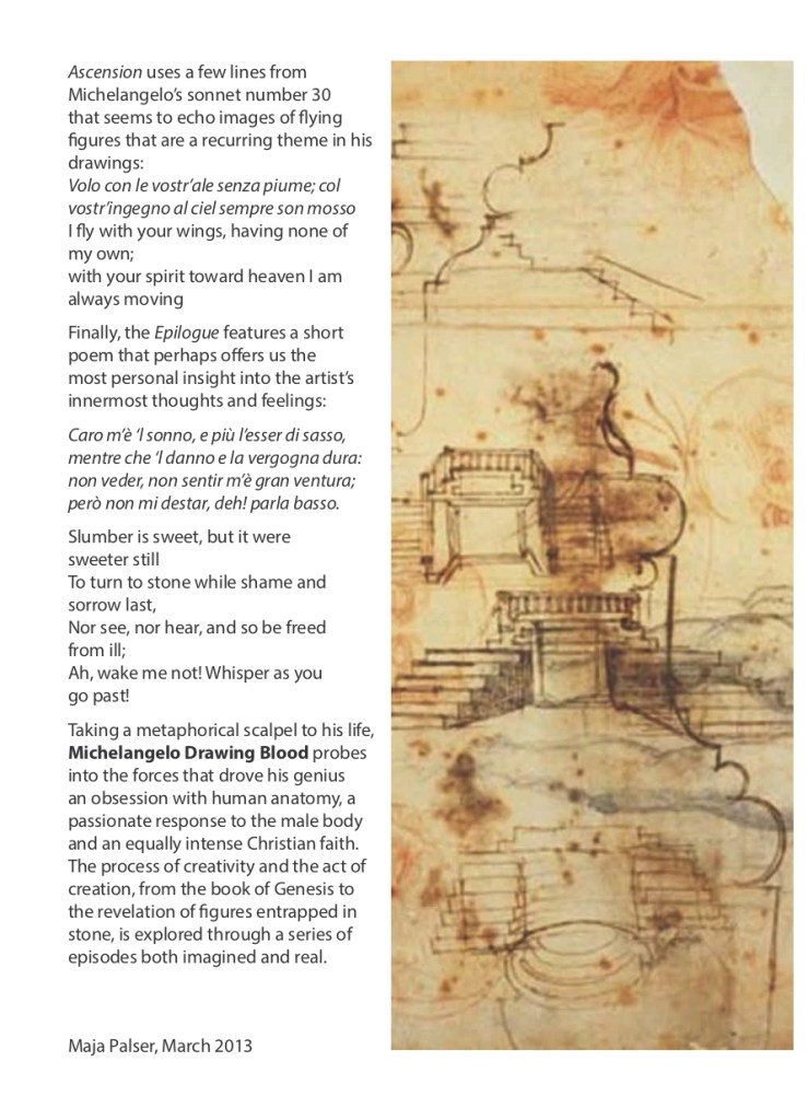 Inspired by Michelangeloโs sketchbooks, sonnets and figure studies, Michelangelo Drawing Blood uses as a starting point the artistโs own concept of “releasing” a sculpture, and explores the process of creativity and creation.