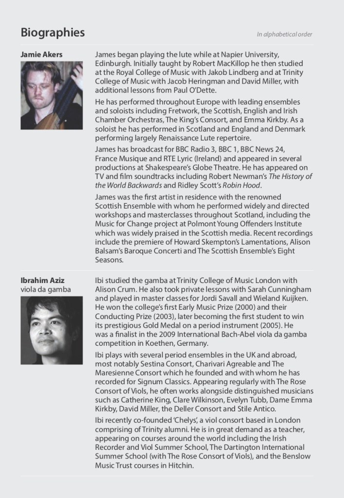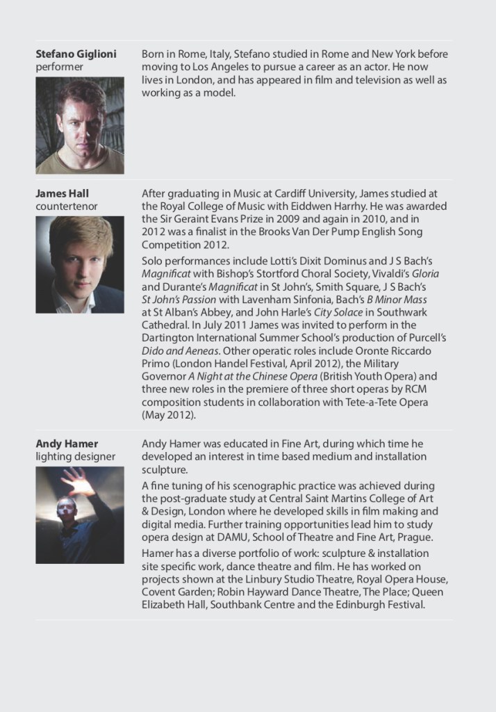 First performed at Forum Theatre, Malvern on 22 March 2013 with James Hall (countertenor), Lรกszlรณ Rรณzsa (bass recorder), Jamie Akers (theorbo), Michael Clark (percussion), Ibrahim Aziz (viola da gamba), Aaron Jeffrey (dancer) and Stefano Giglioni (actor)