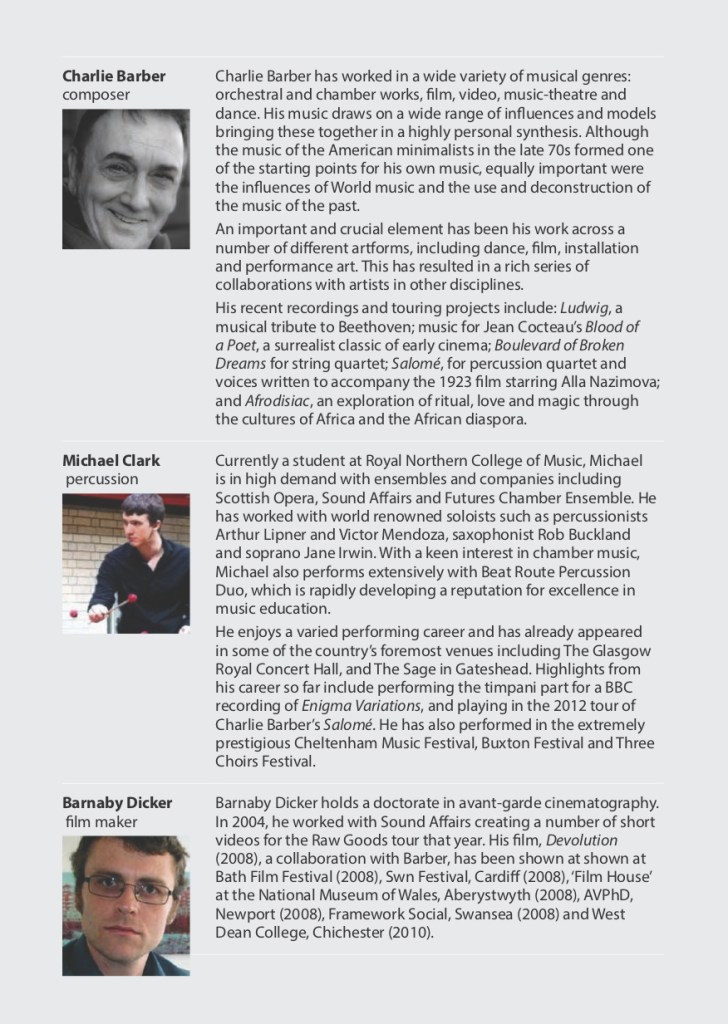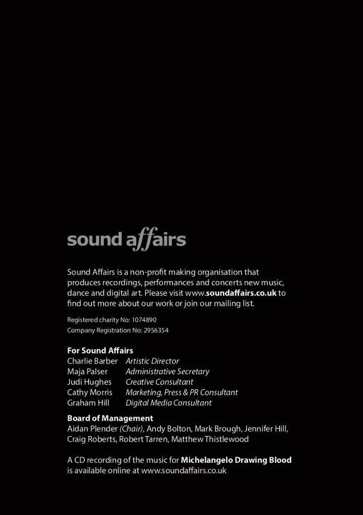 Produced by Sound Affairs with the financial support of: Arts Council of England, Arts Council of Wales, Esmรฉe Fairbairn Foundation, The Radcliffe Trust, Hinrichsen Foundation, The Leche Trust, Gibbs Charitable Trust