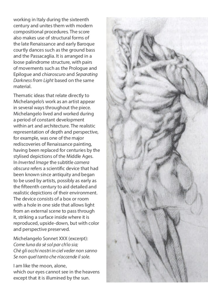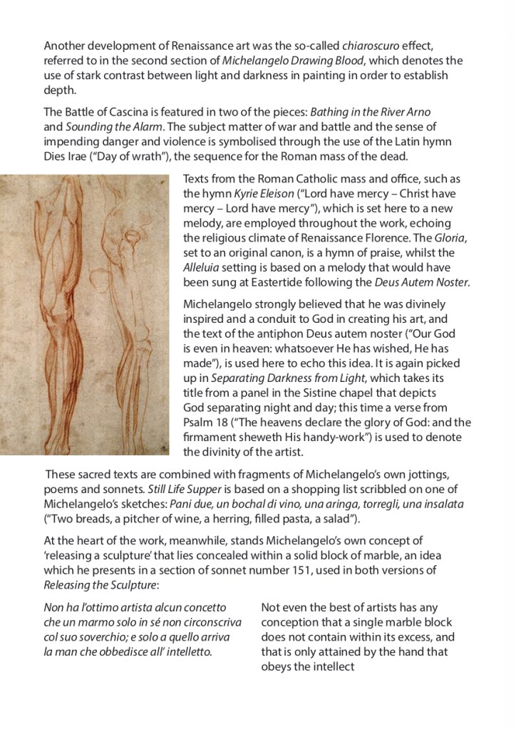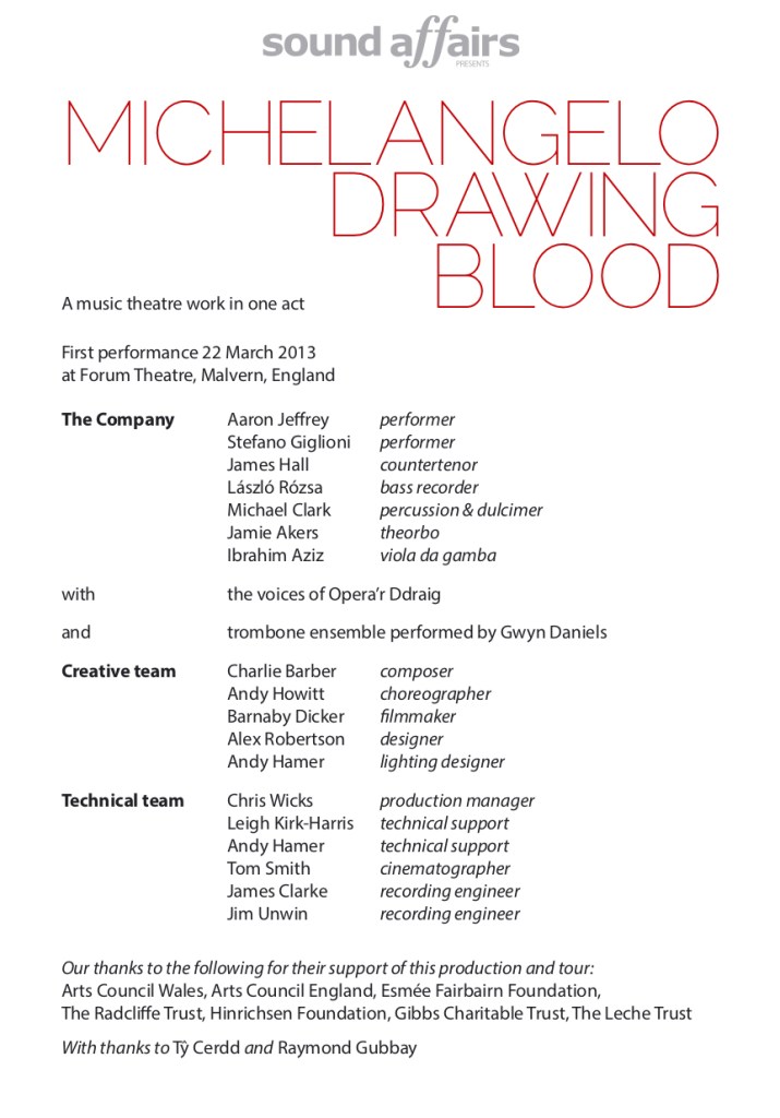 “Barber’s score uses Renaissance instruments โ theorbo, bass recorder, and viola da gamba โ alongside contemporary percussion. Setting extracts from the Catholic mass and from Michelangelo’s own writings (even including a shopping list), Barber creates a palindromic structure over a series of 17 scenes. The music is atmospheric: the clear tone of James Hall’ss countertenor solos have a haunting quality, while antiphonal effects created by pre-recorded material, combining voices with brass instruments, add to the spatial experience…The sculptural element of Alex Robertson’s designs are captured on a suspended bas-relief, on to which video images are projected, but it’s the music’s balance of muscularity and sensitivity that emerges most strongly.”