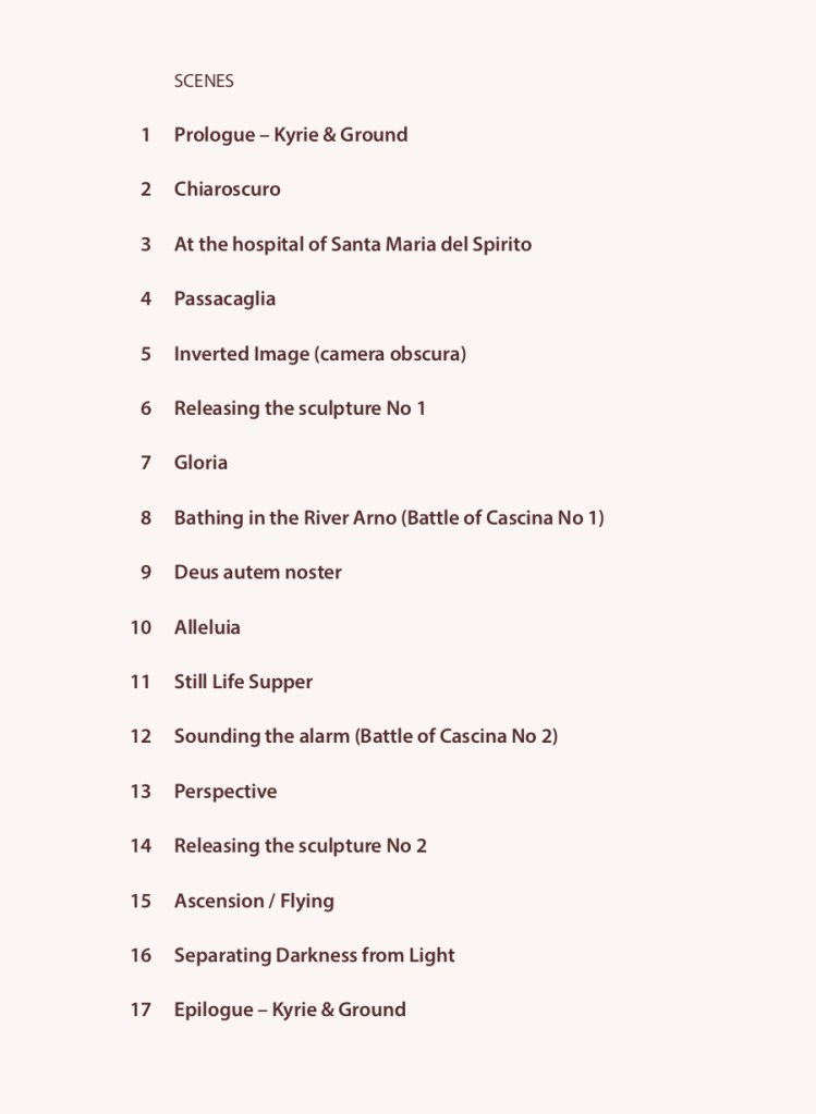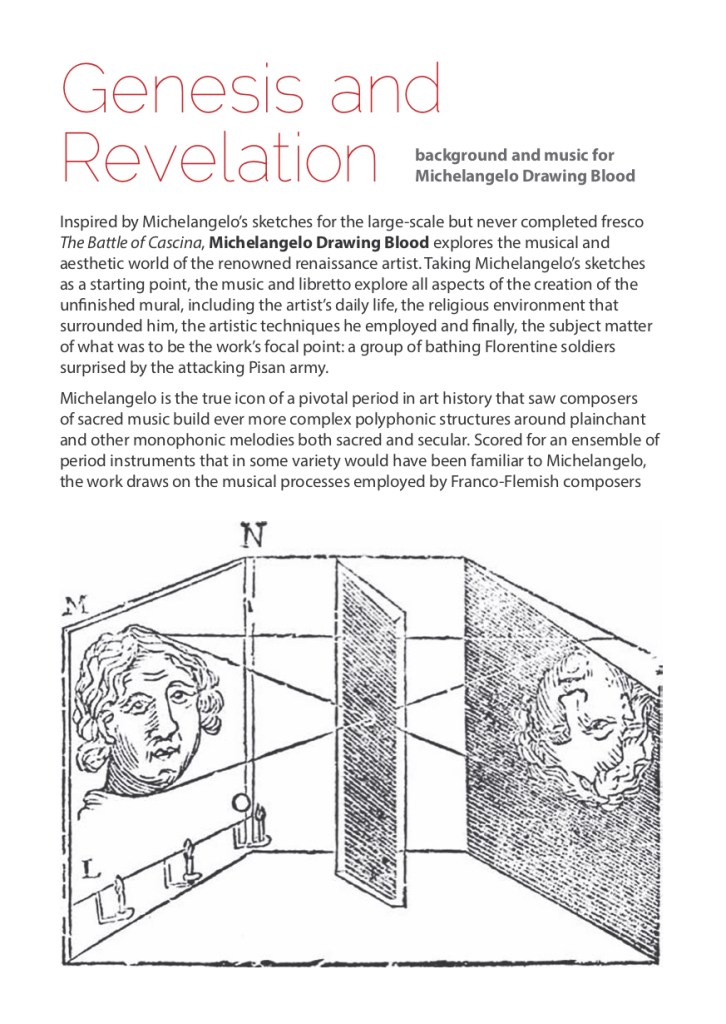 Through a series of a dozen scenes – episodic, real and imagined – the work contrasts Michelangelo’s conception of creativity and divine vision with his own internal struggles.