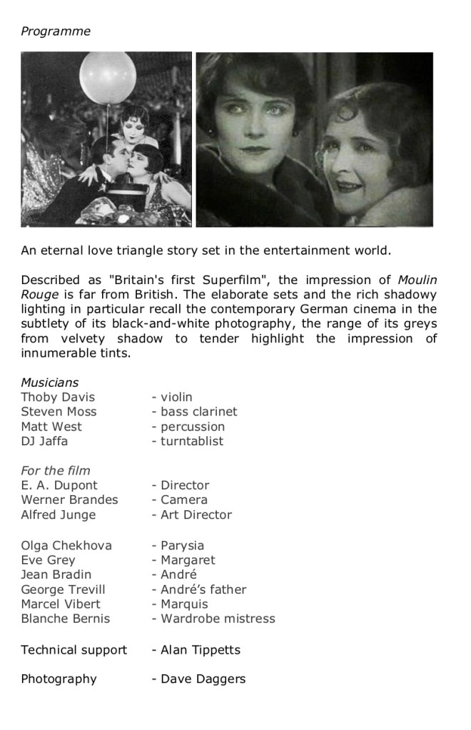 Made in 1928, Moulin Rouge is the story of an eternal love triangle set in the world of entertainment. Though described as โBritainโs first Superfilmโ, the overall impression is far from British. Directed by Ewald Andrรฉ Dupont and featuring Russian actress Olga Tschechowa, the elaborate sets and rich shadowy lighting in particular recall the contemporary German cinema.Charlie Barberโs new score โ performed by four musicians and DJ โ is influenced by both traditional Parisian cabaret and contemporary urban culture.