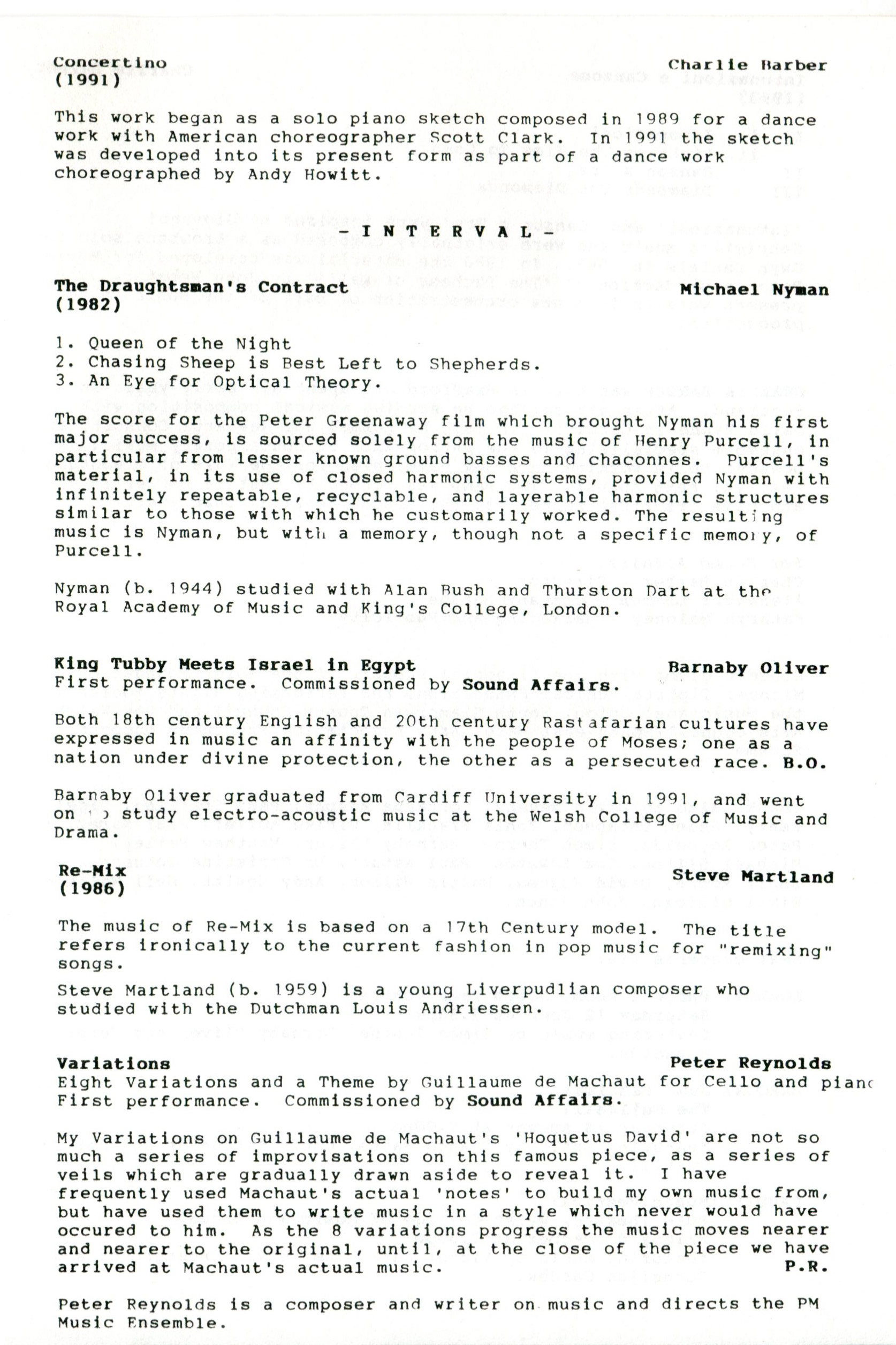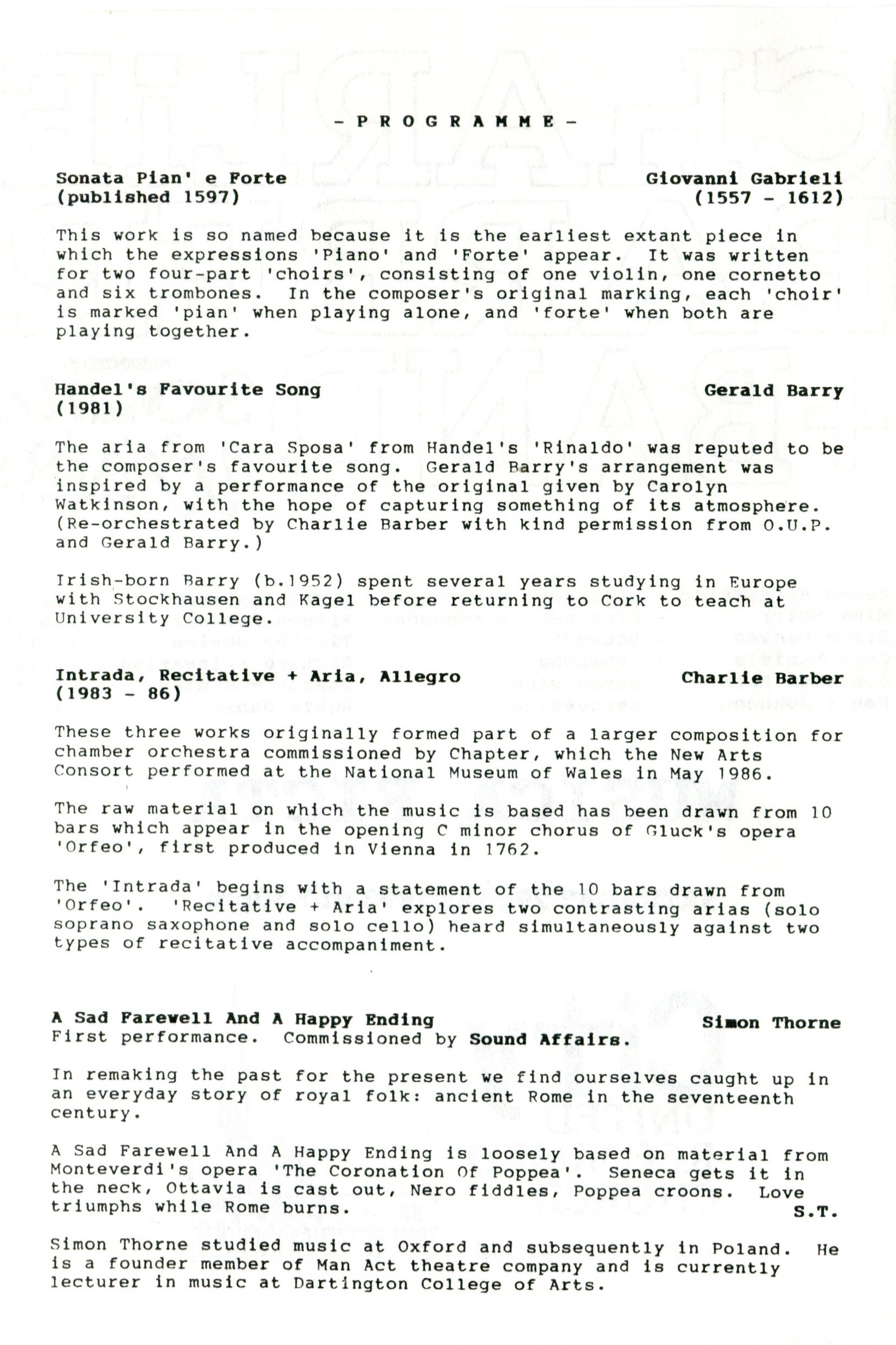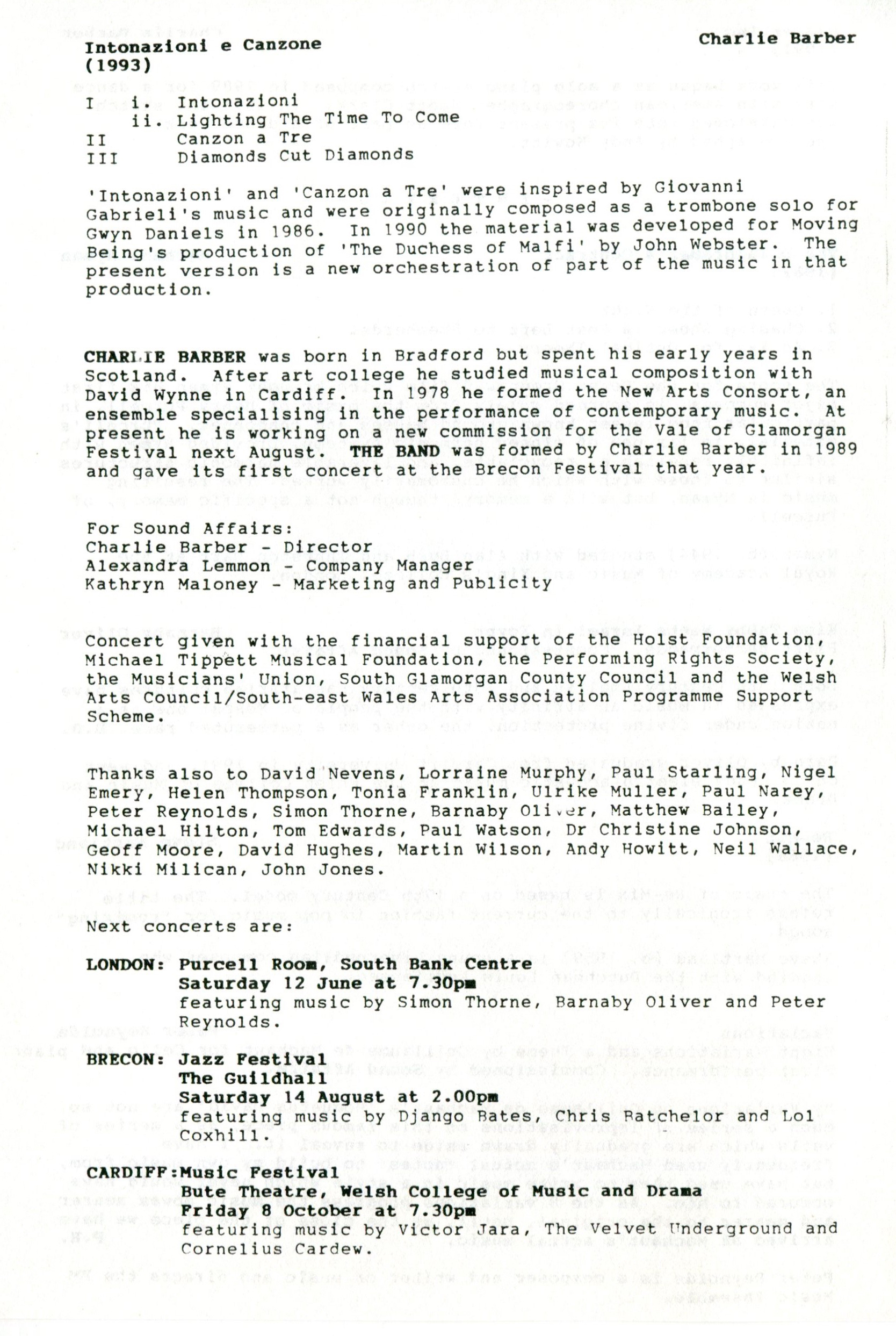 Produced by Sound Affairs with the financial support of: Holst Foundation, Michael Tippett Musical Foundation, Musicians’ Union, Performing Right Society, South Glamorgan County Council and South-east Wales Arts Association