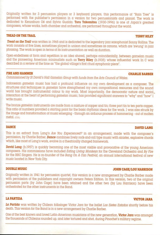 Musicians: 1999 performances: Simon Stewart (clarinet, saxophones), Katie Samways (clarinet, saxophones), Tom Watson (trumpet), Steven Legge (trombone), David Appleton (piano), Harry Fowler (percussion), Colin McCann (percussion), Jonathan Burnett (violin), Liz Norton (violin), Morgan Goff (viola), Sharon McKinley (cello), Paula Gardiner (double bass, bass guitar)