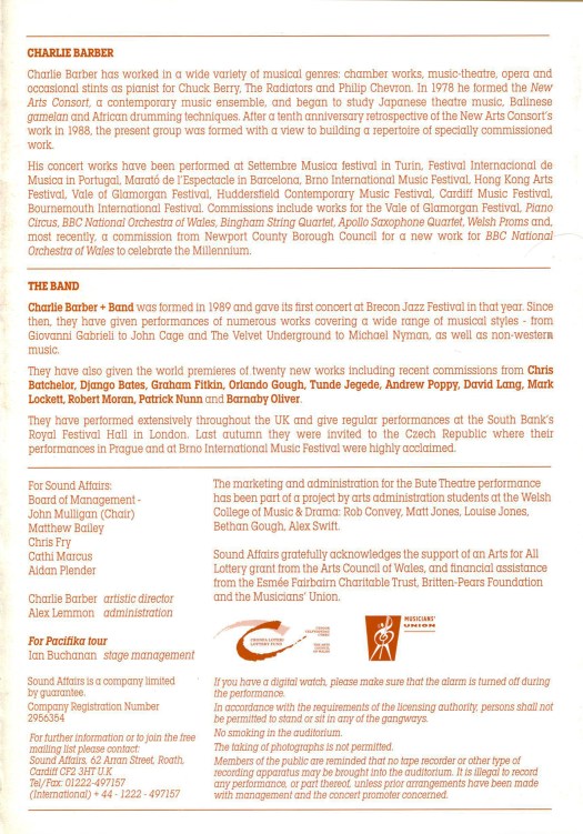 Produced by Sound Affairs with the financial support of: Arts Council of Wales, Musicians’ Union, Performing Right Society