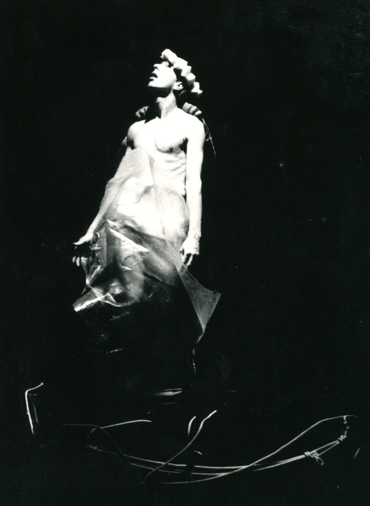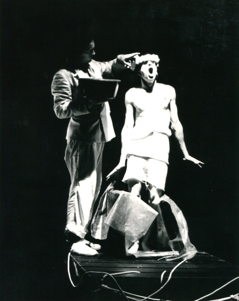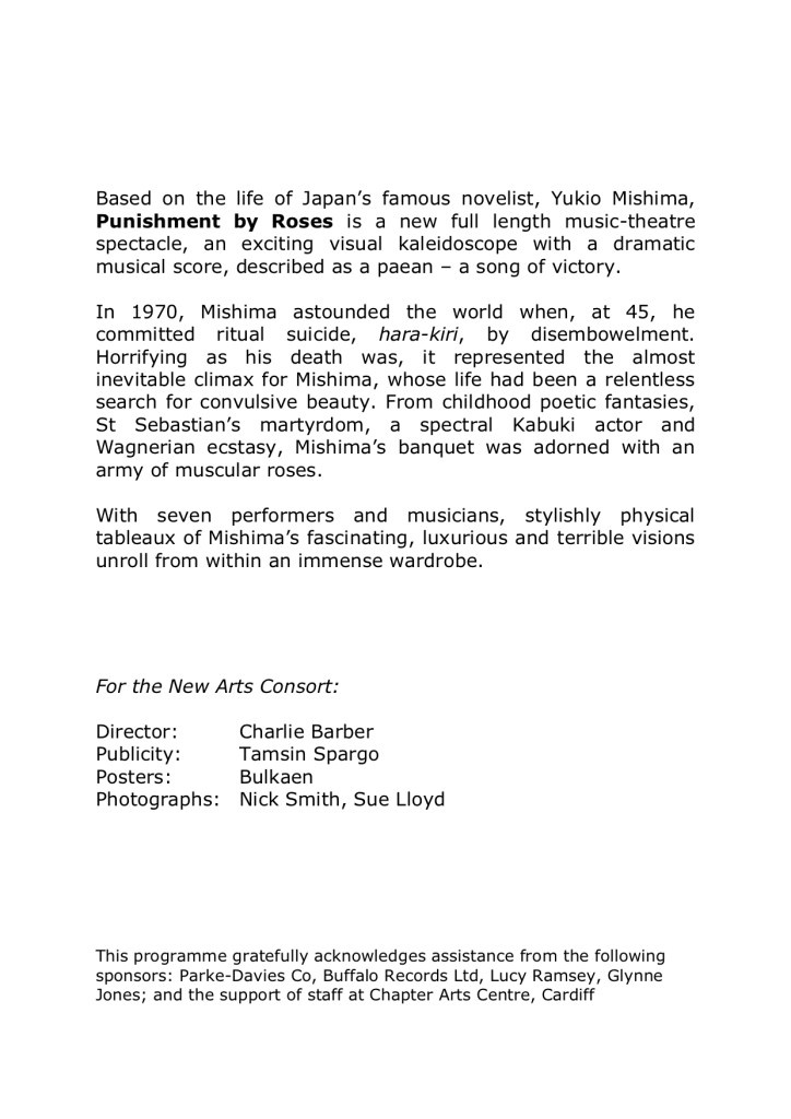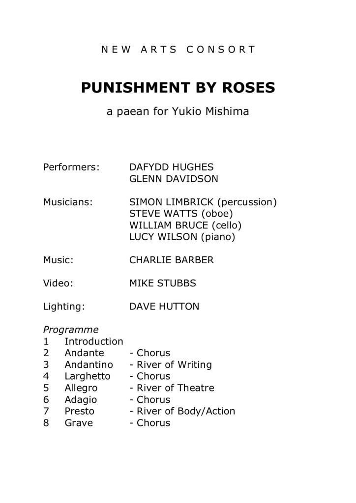 โDescribed as a โmusical theatre spectacleโ and subtitled A paean for Yukio Mishima this production stunningly evokes the life of the Japanese novelist. The haunting music is written by Charlie Barber for percussion, oboe, cello and piano, and its rich texture underscores the dance-mime of Dafydd Hughes and Glenn Davidson. Throughout the performance a simultaneous video recording by Mike Stubbs provides counterpoint to the action.โ Robbie Dinwoodie, The Scotsman, 29 August 1981