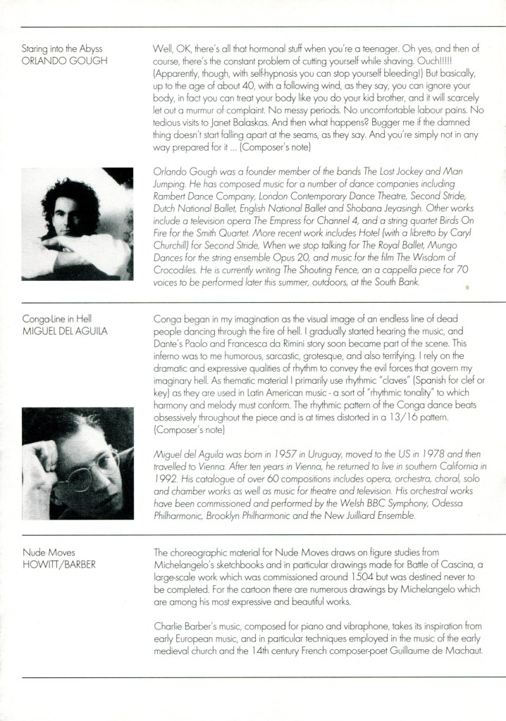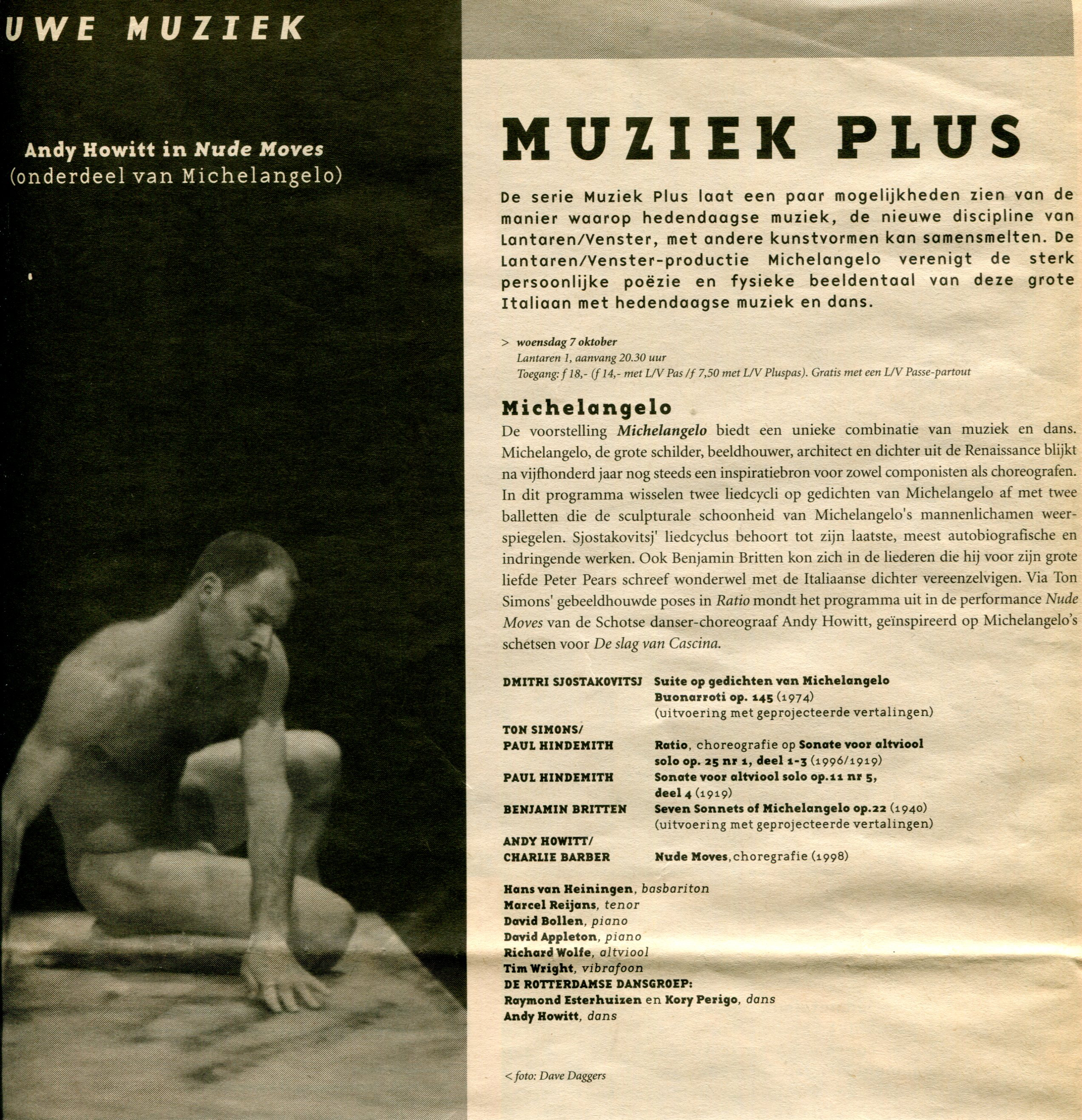 “…This brings us to the evident homo-erotic beauty of Michelangelo’s male bodies, which likewise were the source of inspiration for Nude Moves, a solo, danced naked by the Scottish dancer Andy Howitt. Howitt is a man of muscular build, who, nevertheless, moves with an astounding grace. His robust body alights almost soundlessly on the floor then bounces up with feline elasticity. In Nude Moves Howitt seems to weave together various stylized poses of Michelangelo’s male nudes to form a dance solo performed within a framework of some few square meters of yellow floor. Given the limitations of the available space, the choreography is decidedly impressive.” Martin Bijkerk, Rotterdams Dagblad