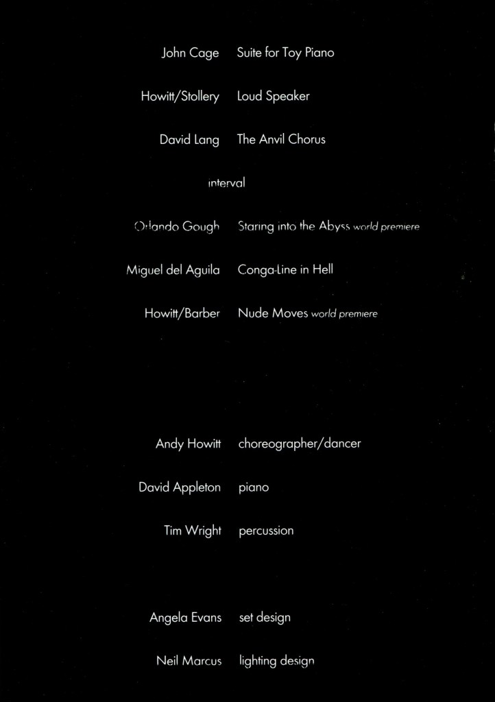 “Howitt’s solos have a chunky fluidity to them…NUDE MOVES is Howitt at his energetic best, a mass of glowering energy confined in a small dance area” Don Morris, The List