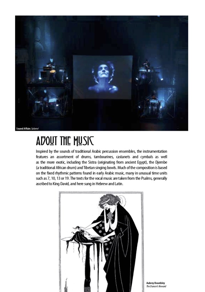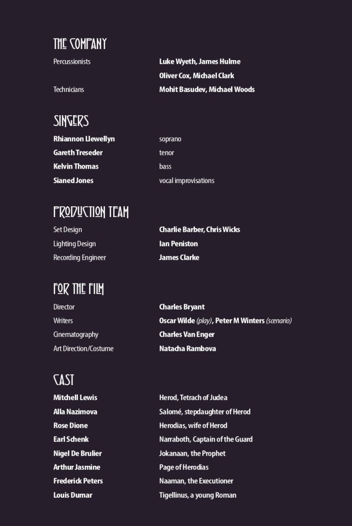 Starring the Russian-born actress Alla Nazimova, Salomé is a rarely seen artwork of film history adapted from the controversial Oscar Wilde play with an abundance of sumptuously fantastic visuals.Made in 1923, Salomé loosely follows the biblical story of King Herod and his desire for his young stepdaughter. It is Salomé’s desire for Jokanaan (John the Baptist) that causes her to dance before Herod….Inspired by the sounds of traditional Arabian ensembles, Charlie Barber’s score is performed by four percussionists against a backdrop of pre-recorded vocal settings of psalms sung in Latin and Hebrew.