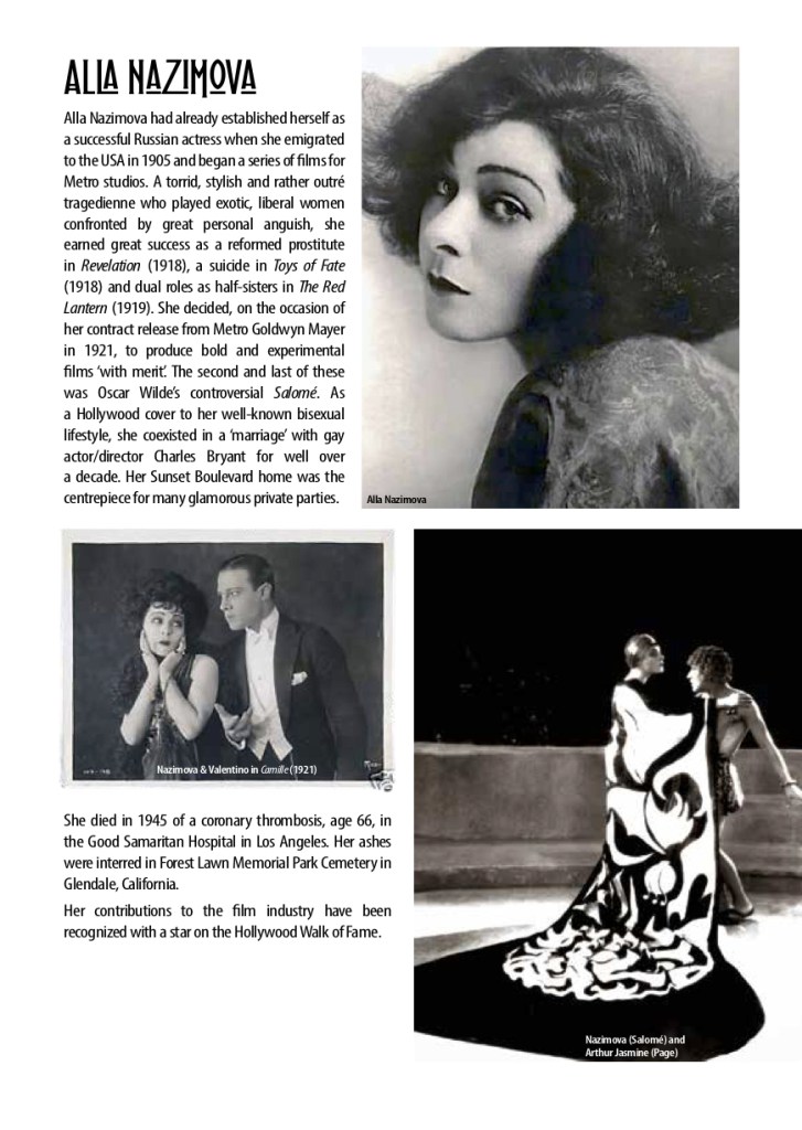 Film cast: Mitchell Lewis (Herod); Alla Nazimova (Salomé); Rose Dione (Herodias); Earl Schenk (Narraboth); Nigel De brulier (Jokanaan); Arthur Jasmine (Page of Herodias)