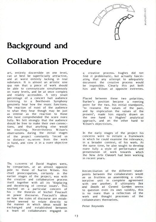 Originally created in 1986 as an orchestral installation, Sex and Death at Covent Garden has been revised, in an abridged version, for concert performance.