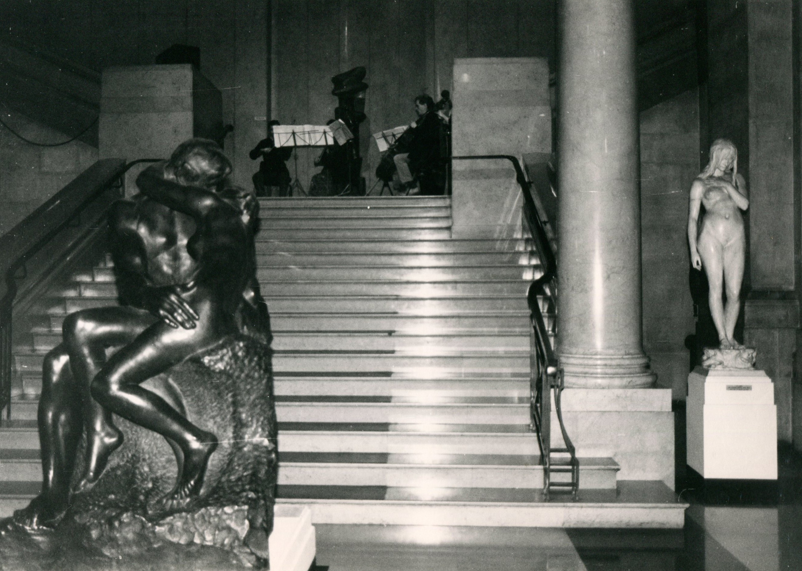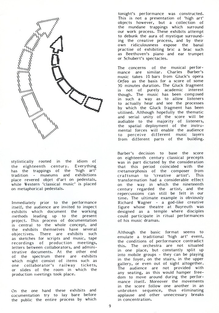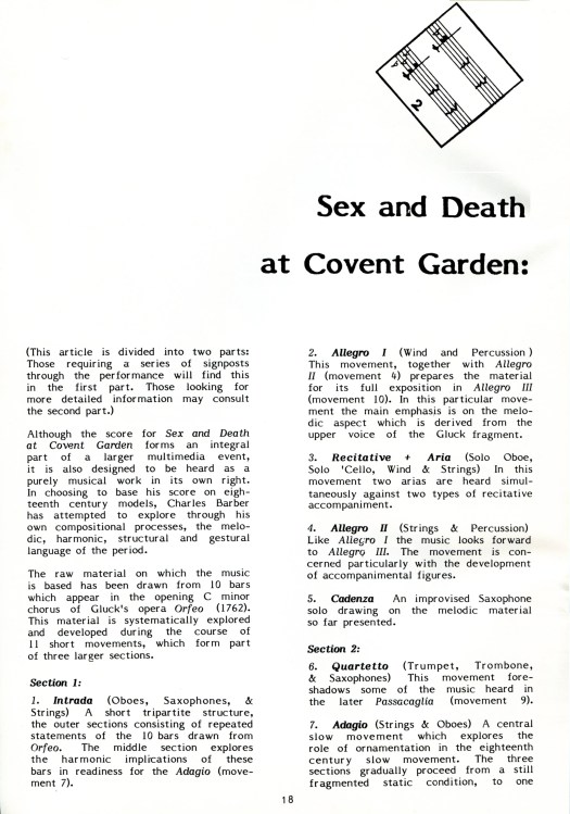 “Charlie Barber’s Sex and Death at Covent Garden intriguingly called ‘an orchestral installation’, is basically an extended composition for chamber orchestra, whose members are ‘constantly re-distributed, splitting into mobile groups to create a wide range of spatial effects’. Sections of the piece come from the heavens, in the gallery of the museum’s high rotunda, other parts from the widely distanced staircases at either end of the hall, and from other more obscure parts, all in the tradition of the spatial antiphony of Gabrieli at St Marks. Barber’s very fine orchestral composition is an extended piece in eleven short movements for thirteen players, entirely derived from ten bars of the opening chorus of Gluck’s opera Orfeo systematically dissected, displaced, and subjected to various compositional procedures. The music stands apart from run of the mill systems music, however, in being rigorously organised but not static, and well able to hold its own developmentally for its 50 minutes duration.”