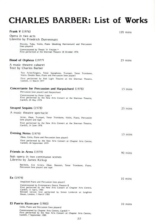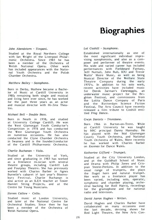 “Charlie Barber’s latest work, Sex and Death at Covent Garden, is a stunning event. Performed by the new Arts Consort in Cardiff’s National Museum of Wales among homoerotic marble sculptures and white-jacketed Canton trendies, it’s reminiscent of those Sixties happenings where the audience was an integral part of the live performance…The orchestra, starting with 10 bars from Gluck’s Orfeo, disperse and reassemble at various points…The music is marvellously sonorous, arranged with the skill that is always apparent in Barber’s work.”