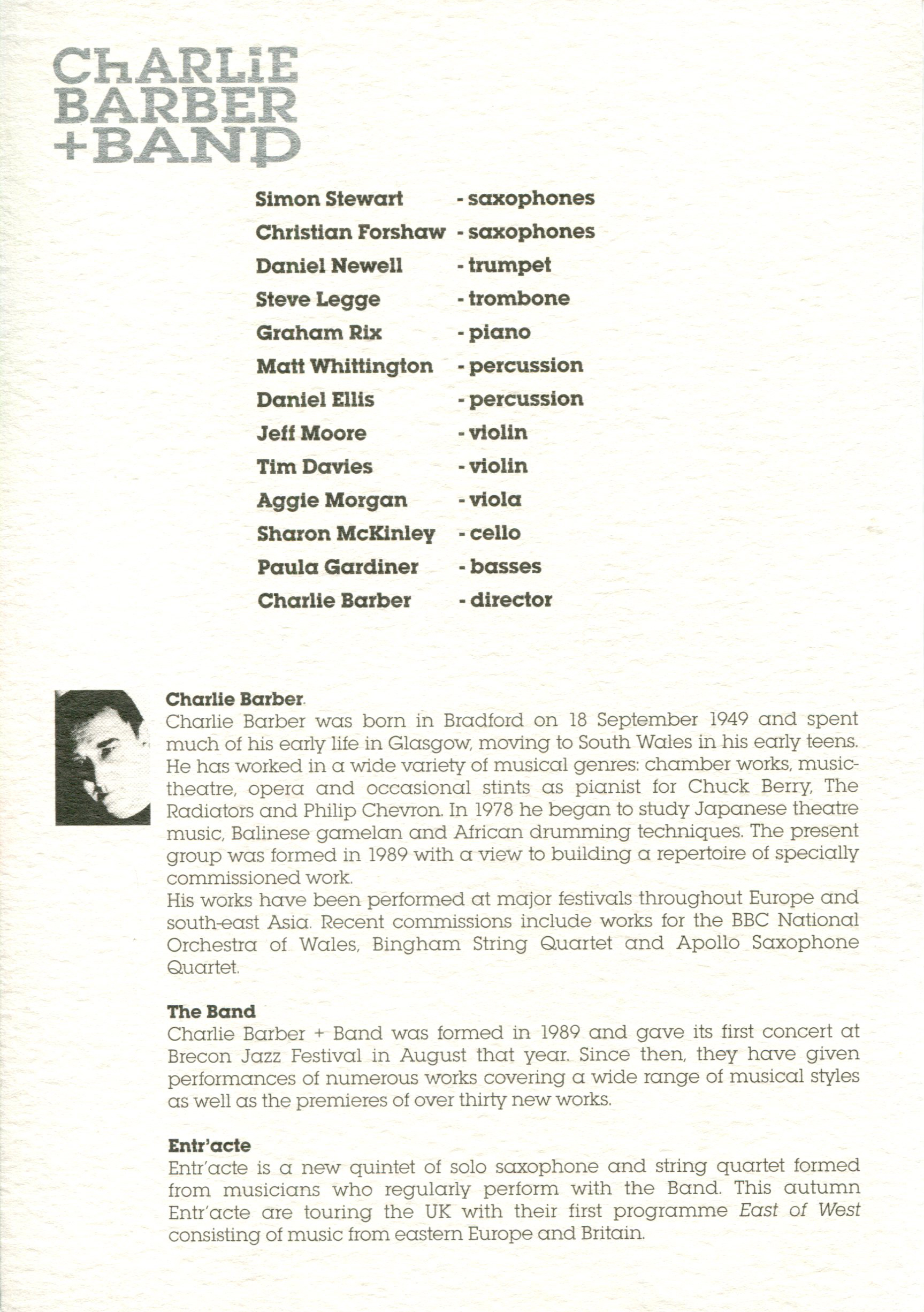 Musicians: Simon Stewart (clarinet, saxophones), Christian Forshaw (clarinet, saxophones), Alan MacDonald (trumpet), Steven Legge (trombone), David Appleton (piano), Harry Fowler (percussion), Matt Whittington (percussion), Jeff Moore (violin), Rebecca Jones (violin), Aggie Morgan (viola), Vicki Higginson (cello), Paula Gardiner (double bass, bass guitar)