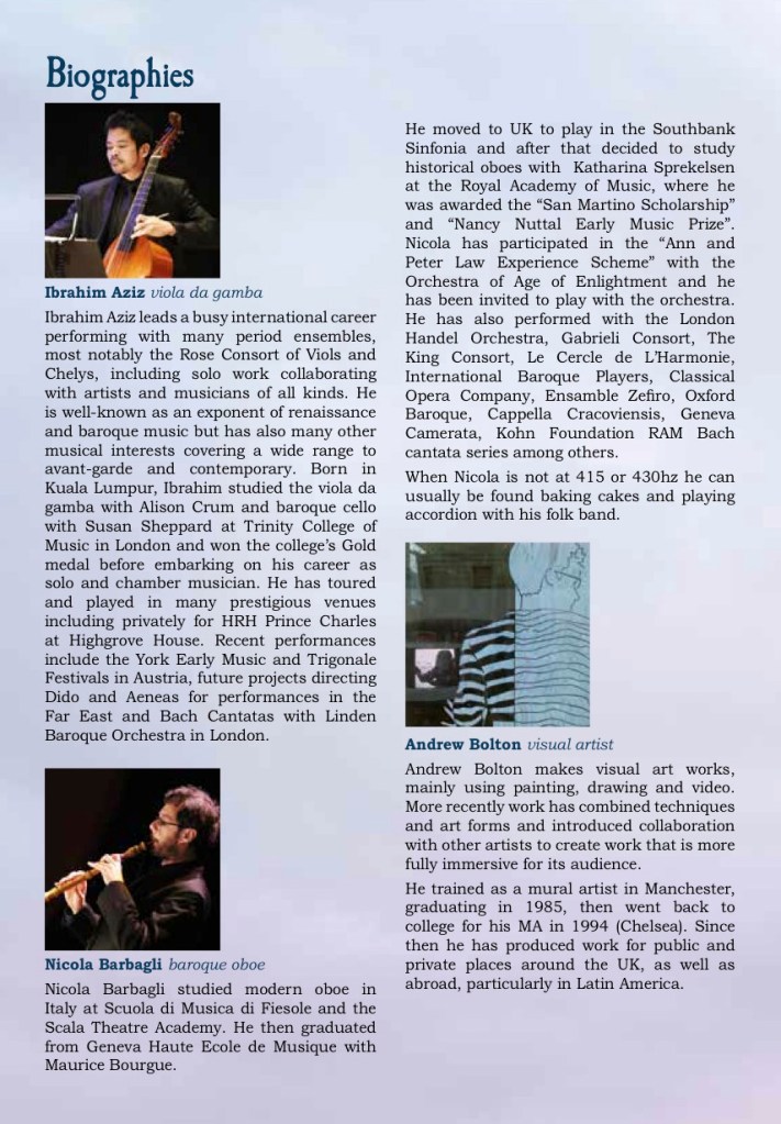 First performed 4 May 2016 at Malvern Theatres with Matthew Venner (countertenor), Jane Chapman (harpsichord), Nicola Barbagli (baroque oboe), Martyn Sanderson (sackbut), Ibi Aziz, Sam Stadlen (viola da gamba), Jan Zahourek (violone)
